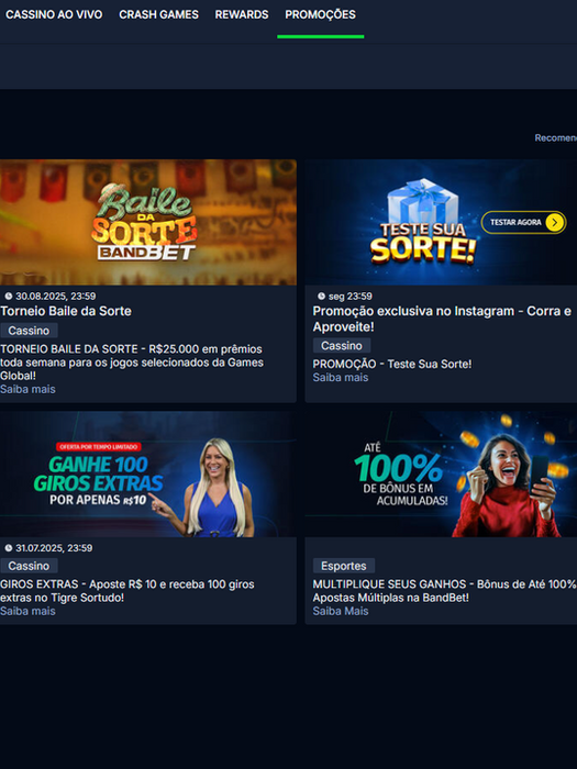 No cassino, há filtros avançados de busca por provedores, modelos de jogos e uma lista com os títulos mais populares dos fãs de slots, salas ao vivo e crash games. Com cores neutras, em tons de azul e verde bem discretos, o site da BandBet no Brasil surpreende por combinar simplicidade e modernidade ao mesmo tempo.